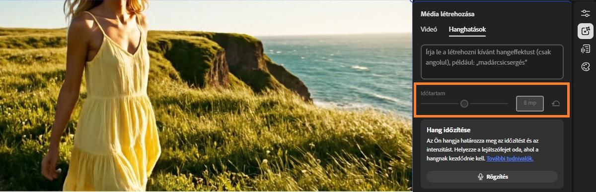 Adjon egyedi hanganyagot videóprojektjeihez hangeffektusok közvetlen létrehozásával a Firefly videószerkesztőben (beta).Leírhatja a kívánt hangot, szabályozhatja annak időtartamát, és opcionálisan rögzítheti a hangját az időzítés és az intenzitás beállításához.