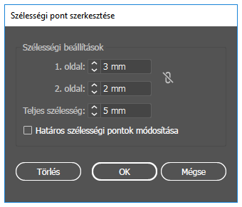 - Több szélességi pontot Shift+kattintással lehet kijelölni. A Szélességi pont szerkesztése párbeszédablakban több pont esetén adjon meg értéket az 1. oldal és 2. oldal mezőkben. A szélességi pontok bármely módosítása minden kijelölt szélességi pontra hatással van.