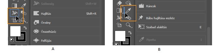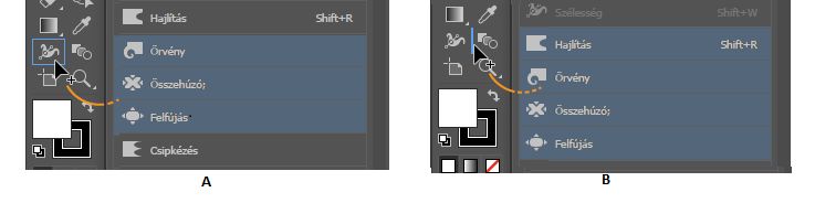 Kattintson egy eszközre az eszköztárban. Ha az eszköz jobb alsó sarkában egy kis háromszög látható, tartsa lenyomva az egérgombot a rejtett eszközök megtekintéséhez, majd kattintson a kijelölni kívánt eszközre.