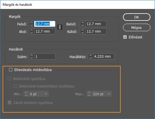 A Margók és hasábok párbeszédablakban jelölje be az Elrendezés módosítása négyzetet. Alapértelmezés szerint ez a négyzet nincs bejelölve.