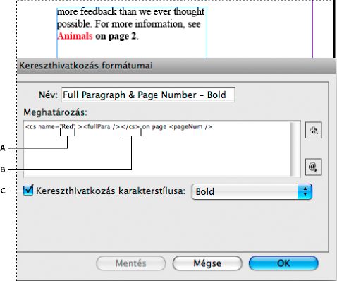 Lásd: <cs name=”bold”><fullPara/></cs>, <pageNum>. oldal Lásd Állatok, a 23. oldalon. Adja meg a karakterstílus nevét, majd foglalja a <cs name=""> és a </cs> címkepáros közé azt a szövegrészt, amelyet el kíván látni a karakterstílussal. Lásd Karakterstílusok alkalmazása kereszthivatkozásokon belül. |