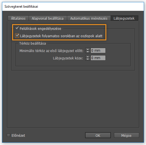 Jelölje be a Felülírások engedélyezése és Lábjegyzetek folyamatos sorokban az oszlopok alatt négyzetet.
