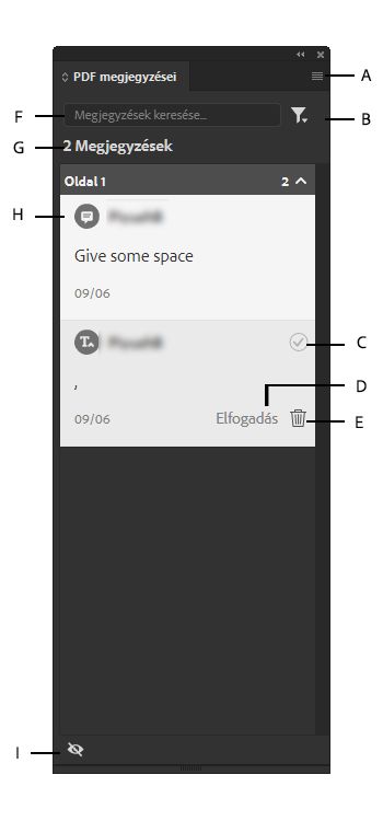 A. PDF megjegyzései panel menüje B. Megjegyzések szűrése C. Megjelölés megoldottként/megoldatlanként D. Megjegyzés elfogadása E. Megjegyzés törlése F. Megjegyzések keresése G. Megjegyzések száma H. A megjegyzés típusa I. Megjegyzések mutatása/elrejtése az elrendezésen