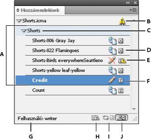 A hozzárendelések kezelésére szolgáló elsődleges eszköz a Hozzárendelések panel (InCopy: Ablak > Hozzárendelések, InDesign: Ablak > Szerkesztői > Hozzárendelések). A Hozzárendelések panel megjeleníti az éppen aktív InDesign-dokumentumból exportált fájlokat, valamint az azok állapotát jelző ikonokat. A Hozzárendelések panel menüje továbbá olyan parancsokat is tartalmaz, melyekkel szabályozhatók az importálási verziók és a fájlkezelési funkciók az InCopy és az InDesign program között. Amikor megnyit egy hozzárendelést az InCopy programban, a hozzárendelés neve és tartalma megjelenik a Hozzárendelések panelen. A Hozzárendelések panelen a szöveg- és grafikakeretekre duplán kattintva kijelölheti azokat a dokumentumablakban.