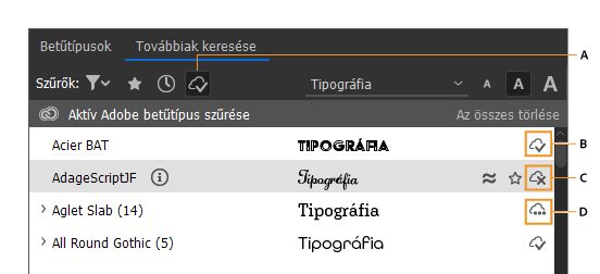 A. Aktivált betűtípusok szűrő B. Betűtípus aktiválása ikon C. Betűtípus deaktiválása ikon D. Aktiválás folyamatban ikon
