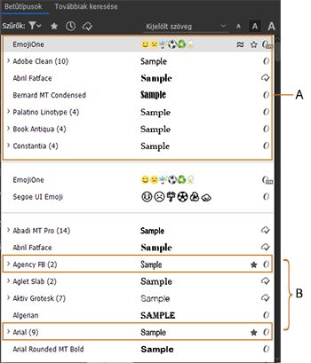 A változtatható betűtípusok helyének megjelenítéséhez figyelje az ikont a betűtípus neve mellett.