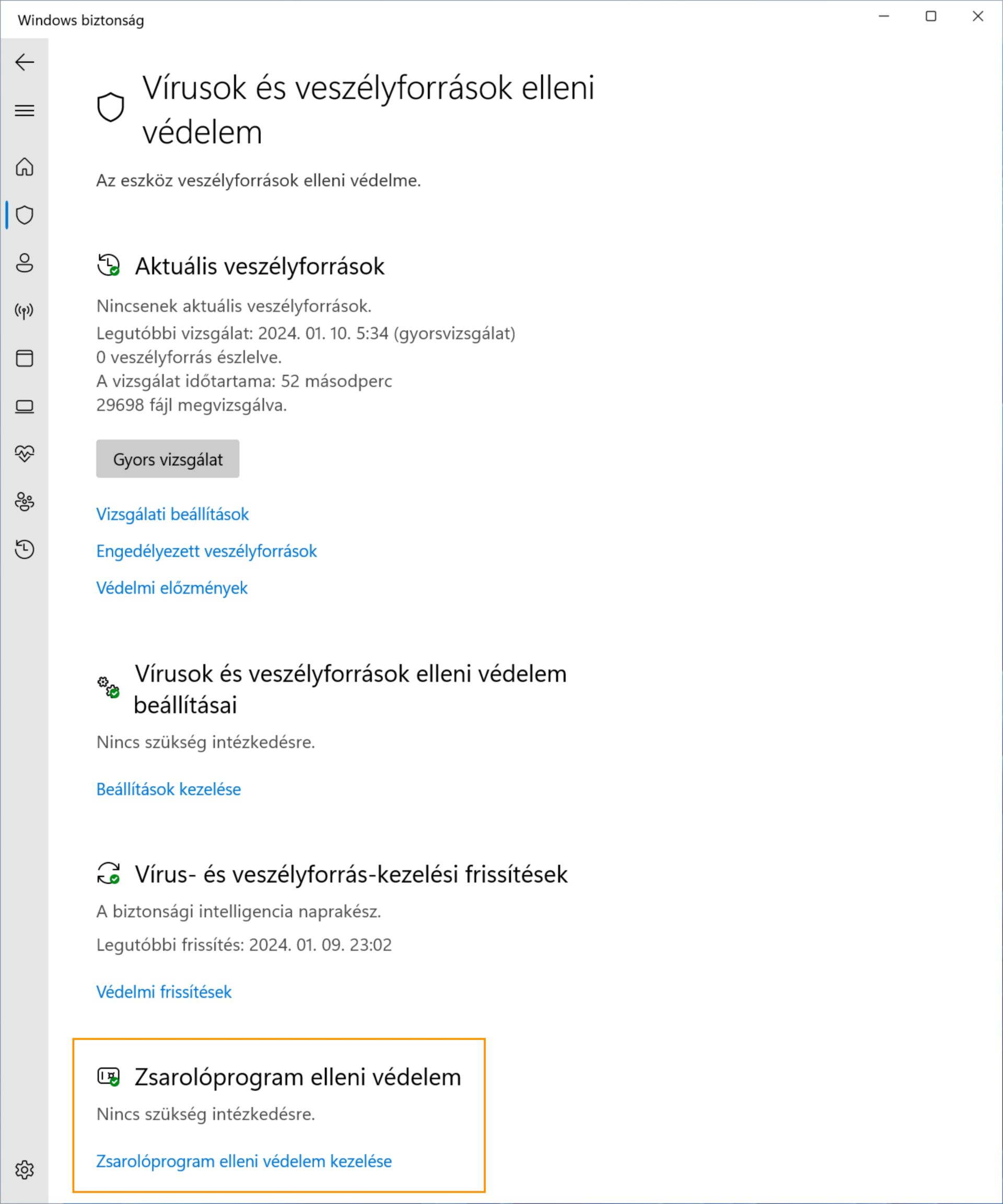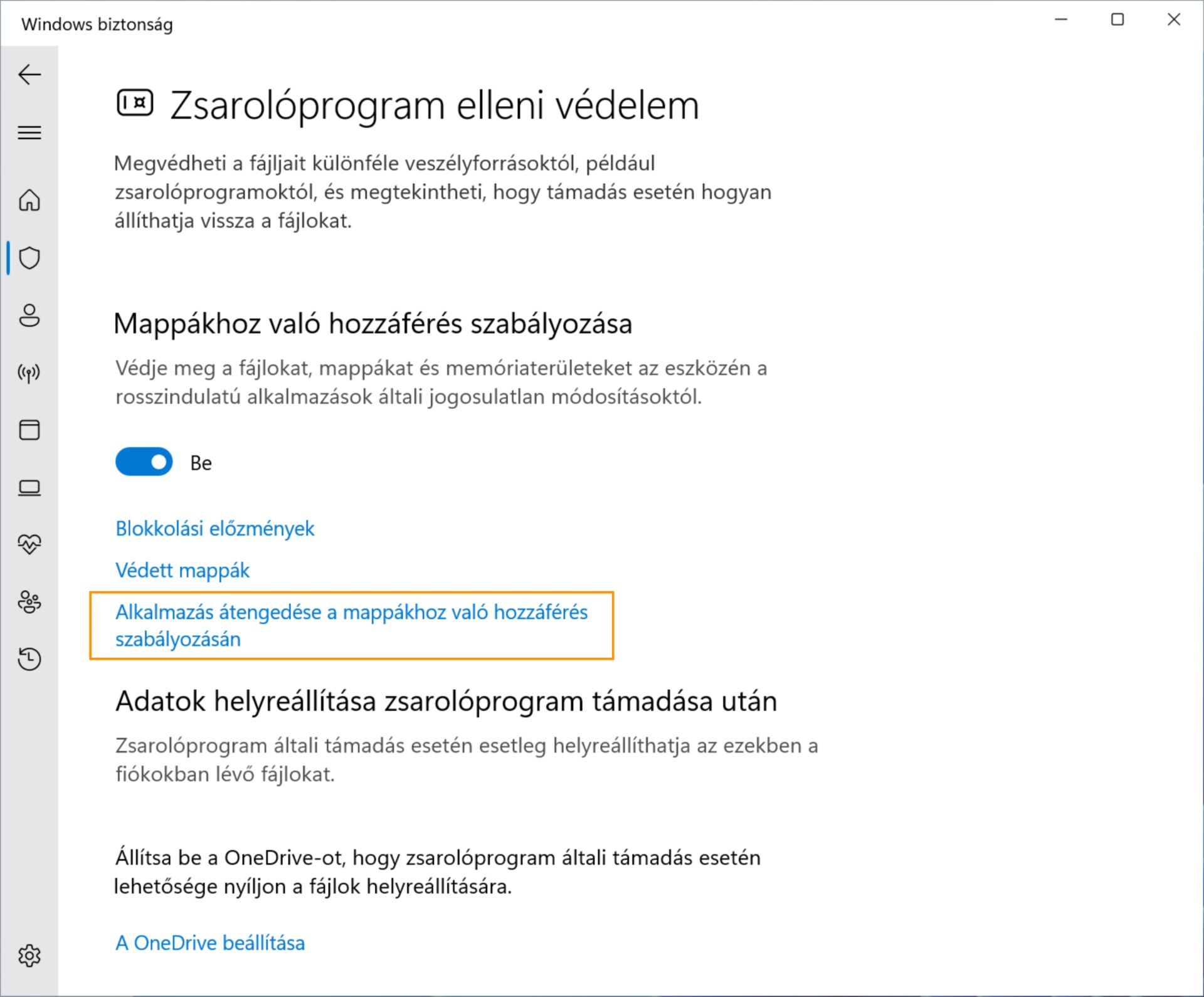 A Vírusok és veszélyforrások elleni védelem beállításainál válassza a Zsarolóprogram elleni védelem lehetőséget.