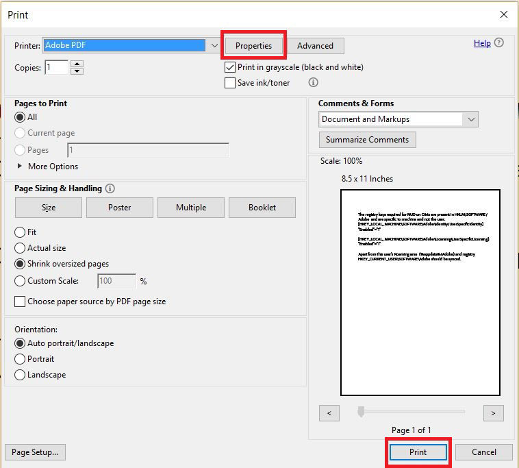 Open a PDF in Acrobat on Windows and go to print, the Print dialog box opens up but nothing happens when you click Print or Printer Properties.