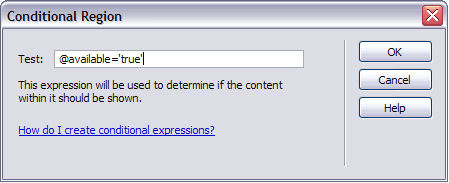 You can write a simple conditional expression to insert into your XSLT page. If content is selected when you open the Conditional Region dialog box, the content will be wrapped in an <xsl:if> block. If you rcontent is not selected, the <xsl:if> block is added at the insertion point on the page. It’s a good idea to use the dialog box to get started and then customize the expression in Code view.