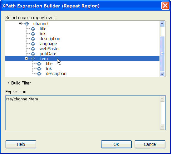 XPath Expression Builder (Repeating Region) dialog box XPath Expression Builder (Repeating Region) dialog box When you click OK, the following code is inserted in your XSLT page:
