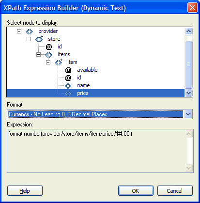 XPath Expression Builder (Dynamic Text) dialog box XPath Expression Builder (Dynamic Text) dialog box This selection would insert the following code in your XSLT page: