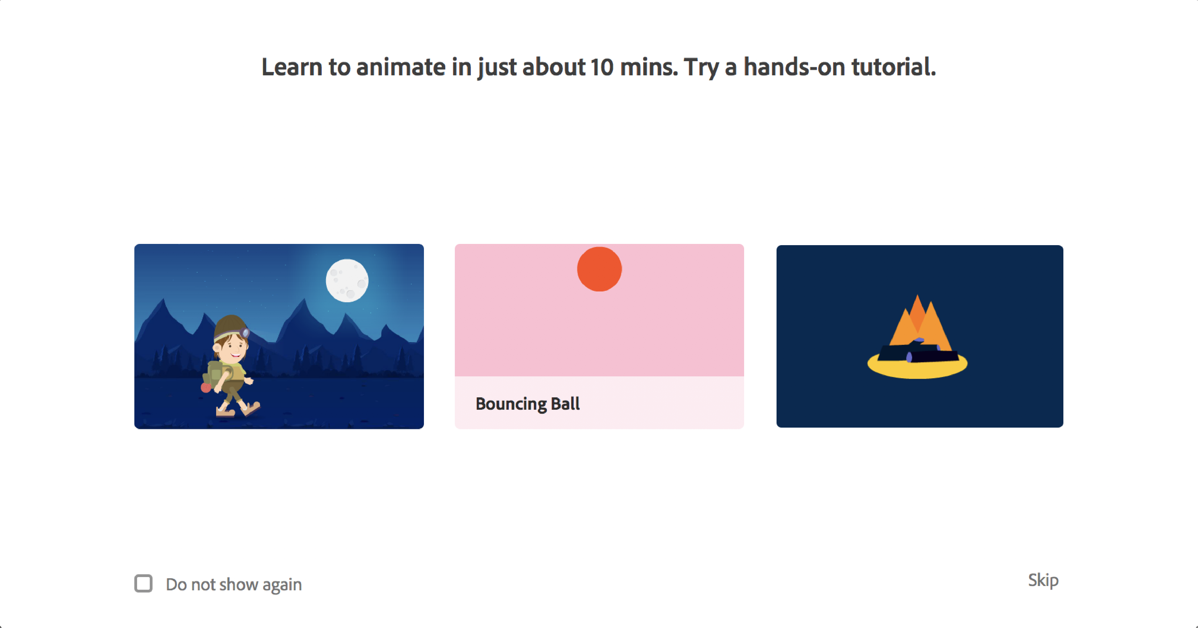 If you are a new user, check out our hands-on tutorials to quickly get started with using Adobe Animate. You can hover over the tutorial to watch a preview..