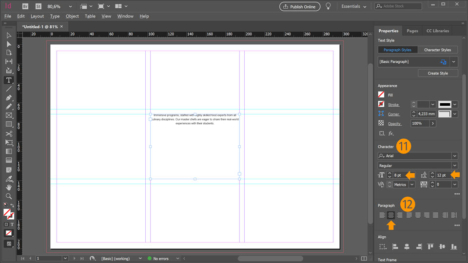 11. Enter some text or copy it from the practice file. On the Properties panel in the Character section chose your desired font, set 8 pt for font size and 12 pt for leading.
