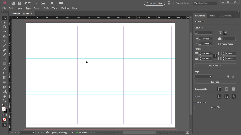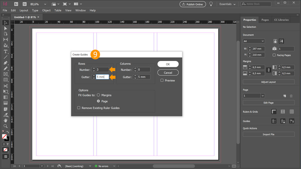 9. For easier placement of text and graphic we will add guides. Go to Layout > Create Guides and type 3 Rows with 5mm Gutter. Click Ok.