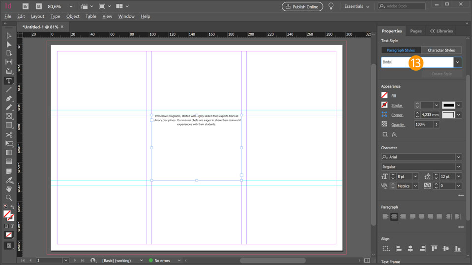 13. On the Properties panel in the Text Style section click on Create Style and enter a name for this paragraph style e.g. "Body" and hit Enter.
