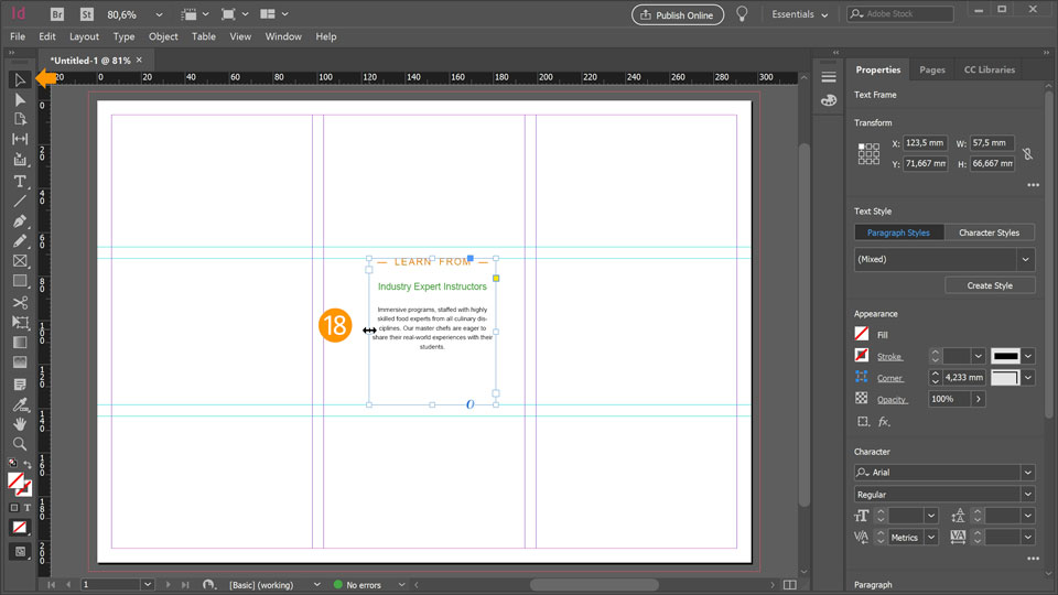 18. From the toolbar chose the Selection Tool and adjust the text box width by clicking and dragging on the text box handles. You can also click inside the text box and place it wherever you want it in your document.