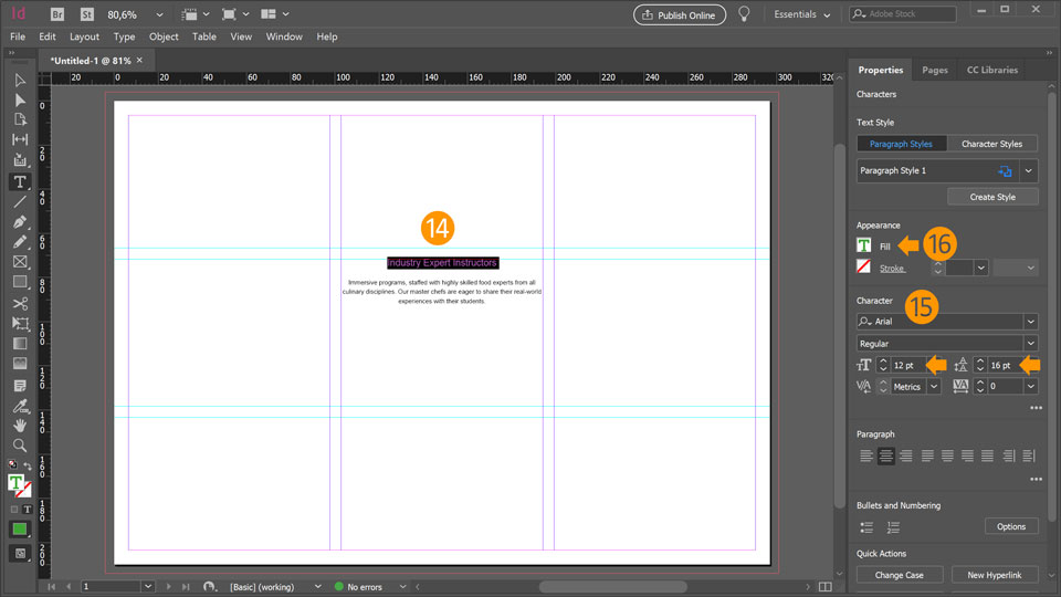 15. On the Properties panel in the Character section chose your desired font, set 12 pt for font size and 16 pt for leading.