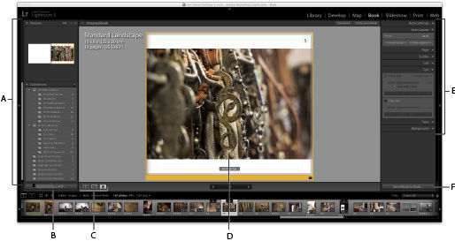 A. Preview and Collections panels B. Export Book to PDF button C. Multi-Page View, Spread View, Single-Page View buttons D. Selected page E. Book Settings panels F. Send Book to Blurb button