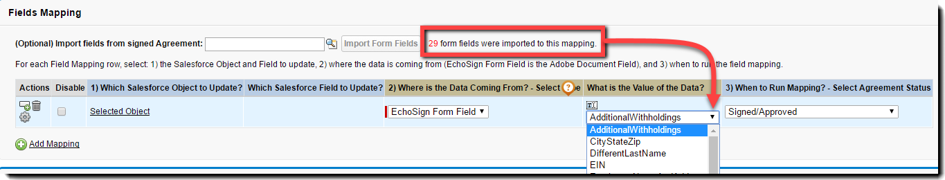 At the top of the Fields Mapping section is an option to Import fields form a signed agreement
