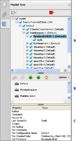 המחבר של מסמך ה-PDF יכול להגדיר דגם תלת-ממד בהגדרות ההמרה כך שבחירה בו תגרום להצגה אוטומטית של Model Tree.