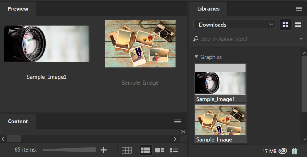 - בחלונית Libraries, בחר נכס אחד או יותר של Adobe Stock.