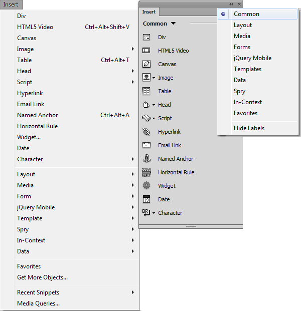 | Spry | Insert > Spry | Insert > Spry | Dataset, Region, Repeat, Repeat List, Validation Text Field, Validation Text Area, Validation Check Box, Validation Select, Validation Password, Validation Confirm, Validation Radio Group, Menu Bar, Tabbed Panels, Accordion, Collapsible Panel, Tooltip |