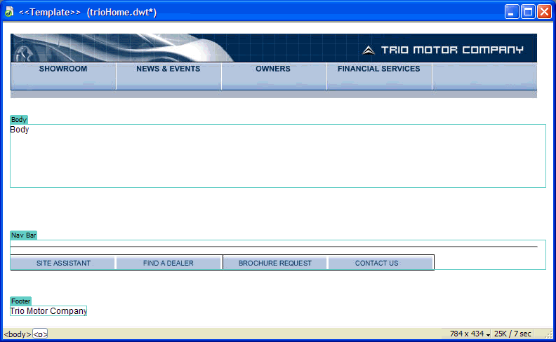 בדוגמה הבאה, התבנית trioHome כוללת שלושה אזורים ניתנים לעריכה בשם Body, Nav Bar ו- Footer: