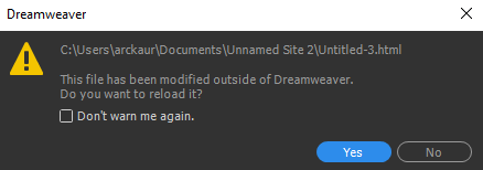 עם זאת, ניתן גם לשנות קבצים באמצעות שורת הפקודה כאשר היישום Dreamweaver סגור. במקרה זה, ההודעה הבאה תופיע בעת הפעלת Dreamweaver בפעם הבאה: