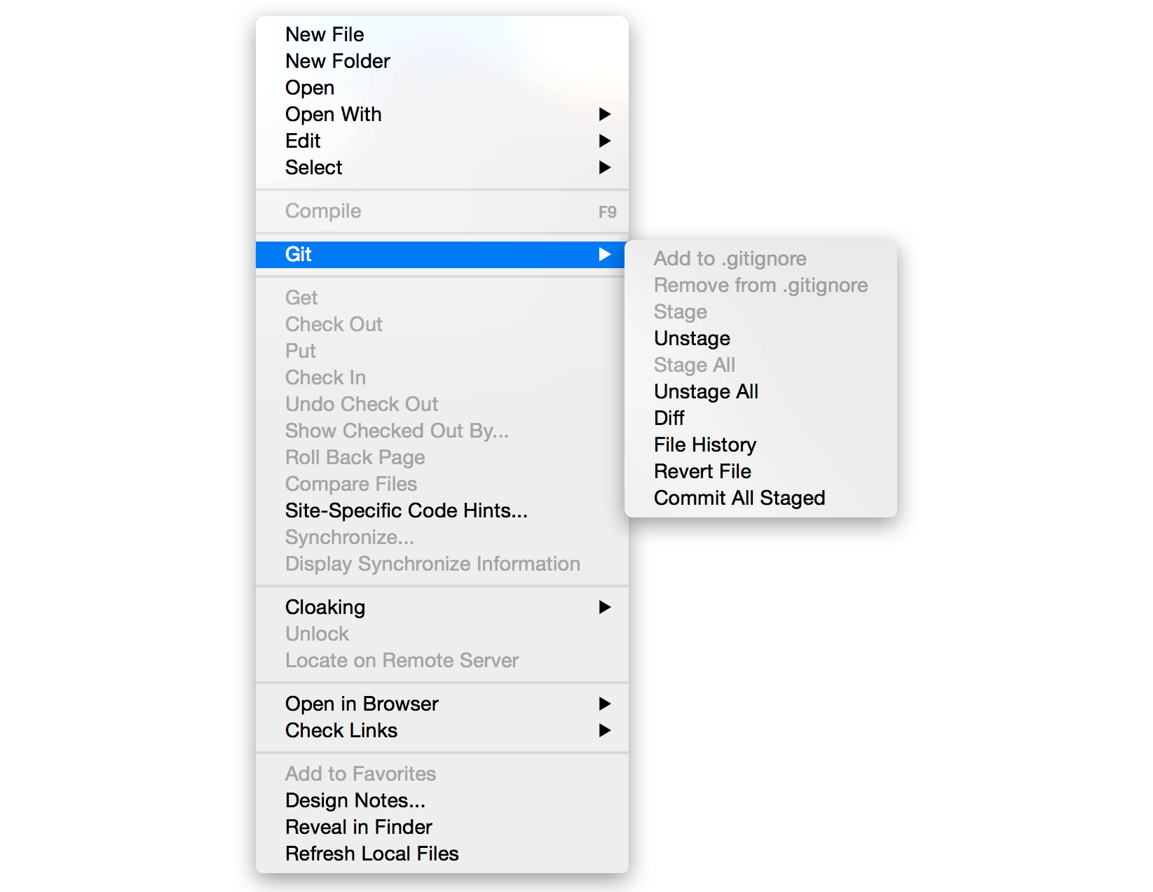 ניתן לבצע את פעולות ה-Git הבאות מתוך Dreamweaver: