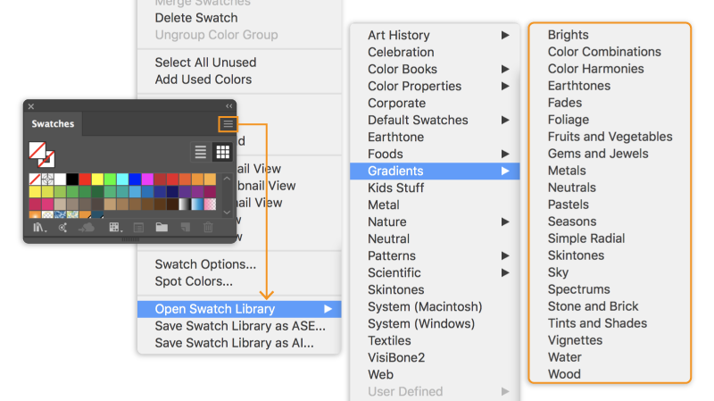 בחרו את Windows > Gradient כדי לגשת ללוח Gradient.