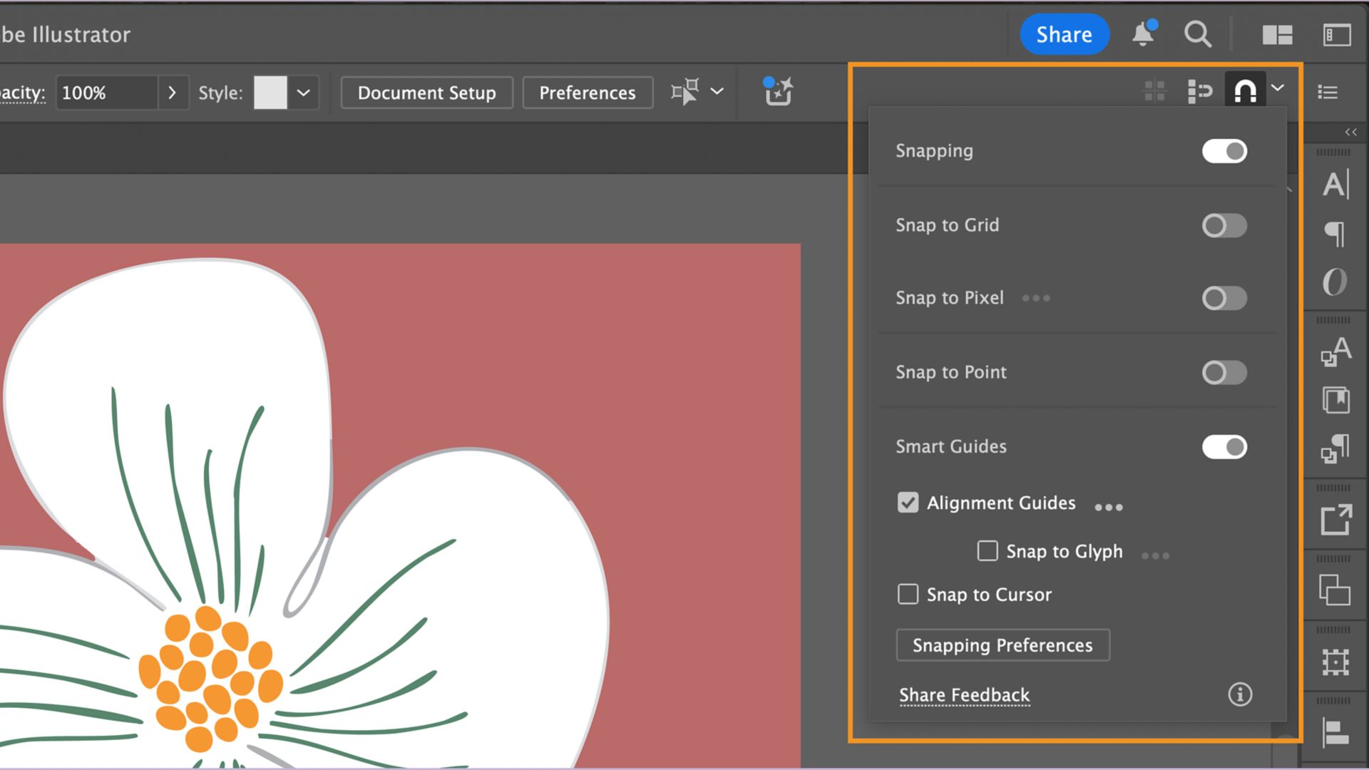 עברו במהירות בין Snap to Grid, Snap to Pixel, Snap to Point ובין Smart Guides ישירות מתוך הלוח Snapping Quick Access שבסרגל Control. השתמשו בלוח כדי לדייק את העדפות ההצמדה באופן מיידי, למשל לפי Alignment Guides ו-Snap to Glyph בשביל להשיג יישור חלק ומדויק יותר בלי להפריע לתהליך העבודה.