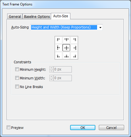 אפשרויות שינוי גודל אוטומטי של מסגרות טקסט מאפשרות להגדיר מסגרות טקסט שגודלן משתנה באופן אוטומטי בעת הוספה, מחיקה או עריכה של טקסט.