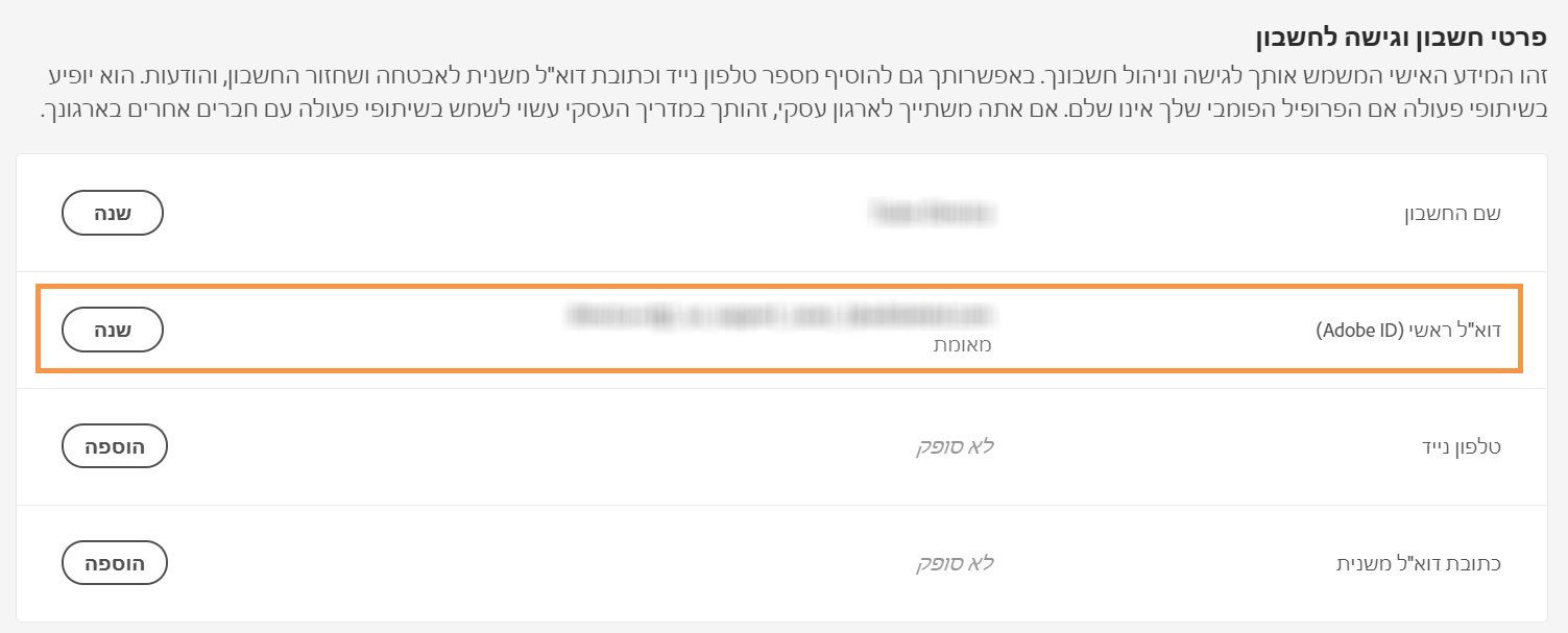 באזור פרטי החשבון והגישה, יש לוודא שהדוא"ל הראשי או Adobe ID נכונים.