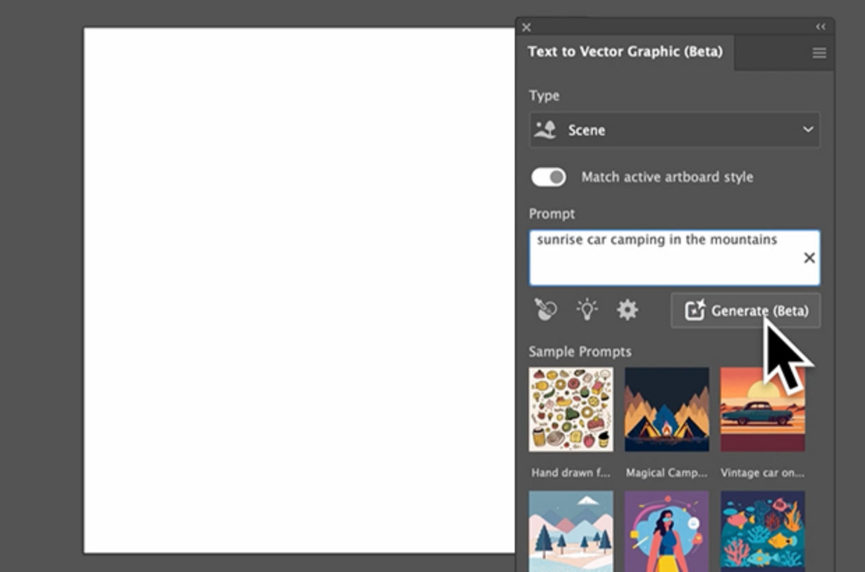 Type in a prompt in the Text to Vector Graphic panel describing the graphic you want to create with everyday words. For example, try something like, “sunrise car camping in the mountains.” -