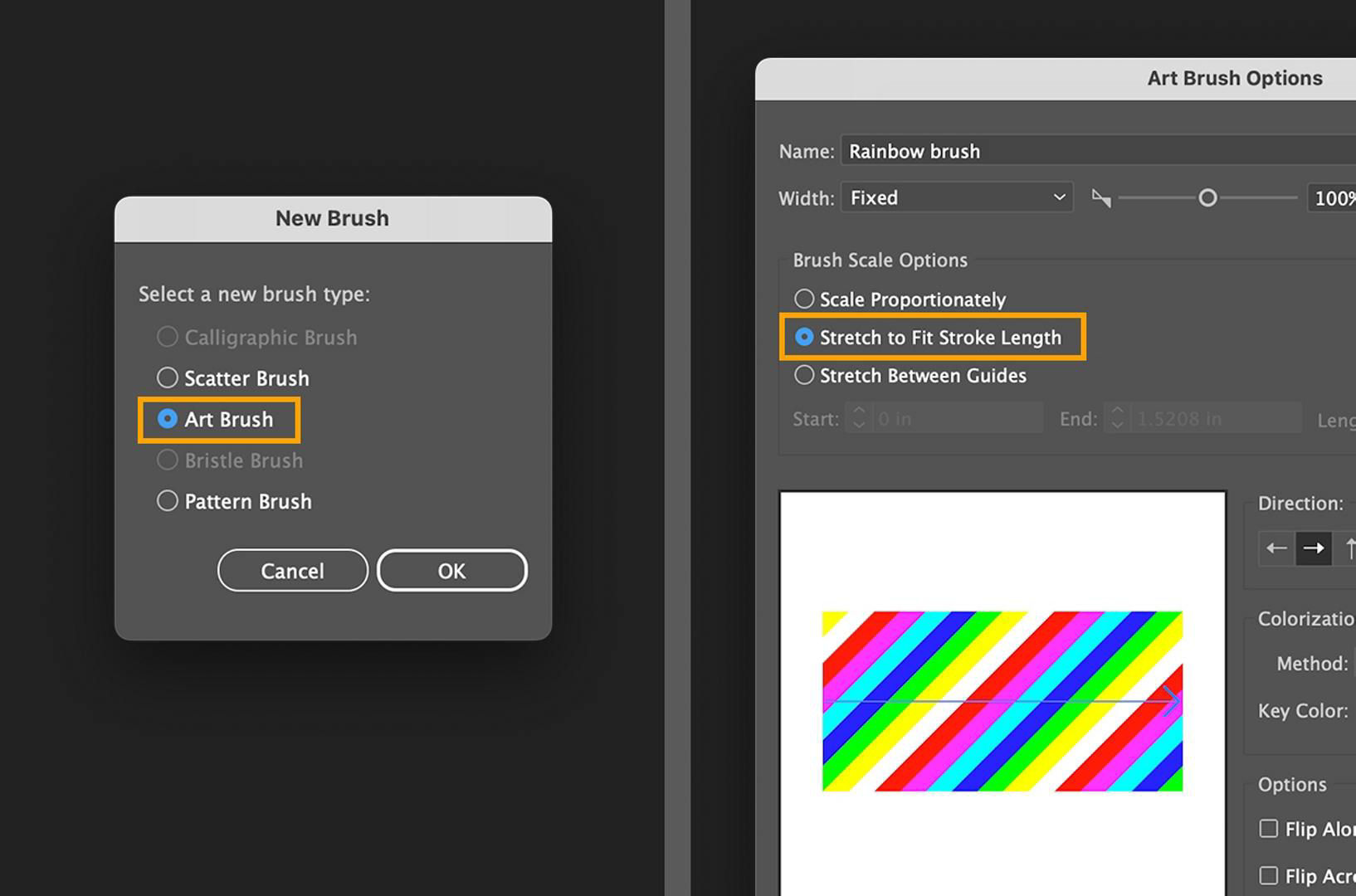 In the New Brush window, choose Art Brush and click OK. Then name the brush, choose Stretch to Fit Stroke Length, and click OK. -