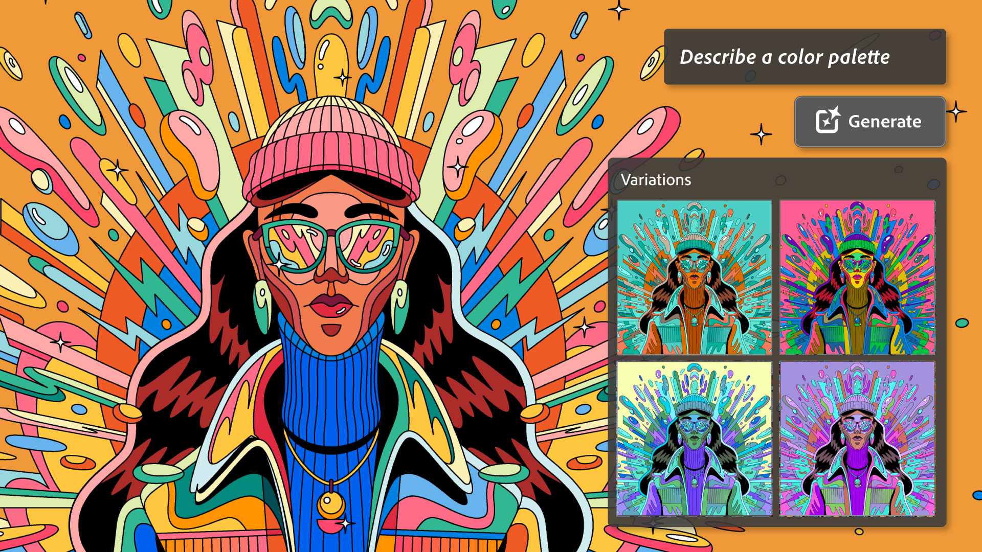 Generative Recolor, fueled by Adobe Firefly, Adobe's family of creative generative AI models, lets you effortlessly transform the colors in your vector artwork into compelling color schemes. Enter a simple description of the desired color theme or palette, and quickly get multiple variations as output. Try out these variations and choose the most fitting one for your artwork. Learn more about Generative Recolor.