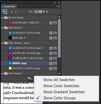Right-click on a color swatch to explore other options. You can switch to a Color Group view and work extensively with color groups. Click the filter icon at the bottom of the panel and select Show Color Groups. This enables you to work with color groups extensively. Root swatches and gradients are not visible in this view.