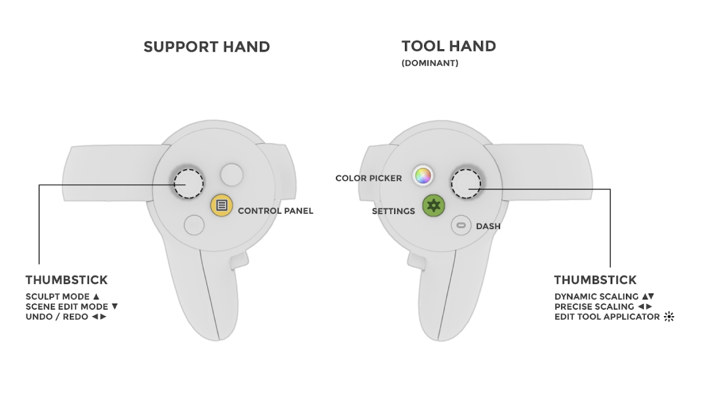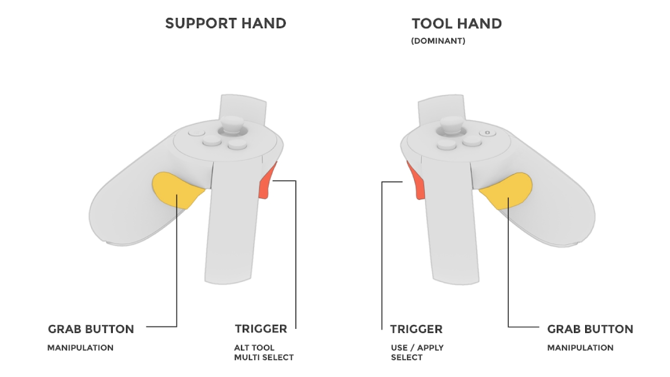 Use this guide to help identify what each button on the Oculus Touch controllers is used for in Medium. Please note: The guide below represents button mappings when the right hand is selected as Tool (dominate) hand.