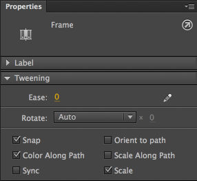 2. With the first keyframe of the tween selected in the timeline, select the options Scale and Scale along path check boxes in the Property Inspector. Now the object is ready to follow the scaling based on the stroke thickness.