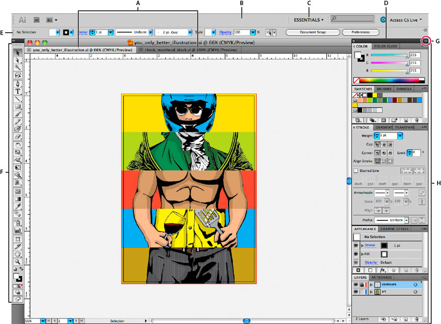 • To undock (float or untab) a Document window from a group of windows, drag the window’s tab out of the group.