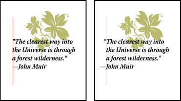 Controls the alignment of punctuation marks for a specific paragraph. When Roman Hanging Punctuation is turned on, the following characters appear 100% outside the margins: single quotes, double quotes, hyphens, periods, and commas; the following characters appear 50% outside the margins: asterisks, tildes, ellipses, en dashes, em dashes, colons, semicolons. To apply this setting, insert the cursor in the paragraph and select Roman Hanging Punctuation from the Paragraph panel menu.
