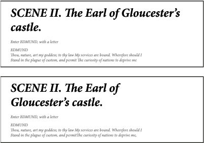 If you choose Justify and you want to prevent the leading value from becoming disproportionately larger than the paragraph spacing value, specify a Paragraph Spacing Limit value. The space between paragraphs is expanded up to the value you specify; if the text still doesn’t fill the frame, the space between lines is adjusted until the frame is filled. The paragraph spacing limit value is applied in addition to the Space Before or Space After values entered on the Paragraph panel.Paragraph spacing limit set to zero (left) and 1 pica (right) Paragraph spacing limit set to zero (left) and 1 pica (right) नोट:Be careful about vertically justifying multi-column text frames. If the last column contains only a few lines, too much white space may appear between the lines.
