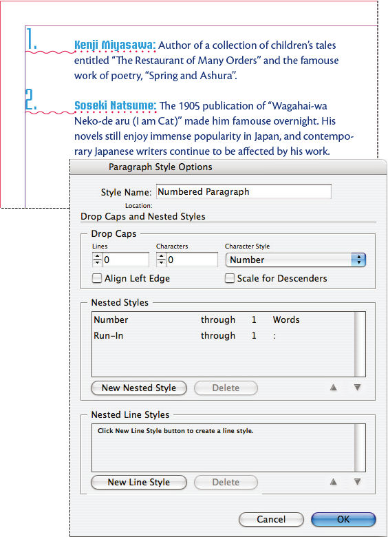 - In the Drop Caps And Nested Styles dialog box, or in the Drop Caps And Nested Styles section of the Paragraph Style Options dialog box, select the nested style and click Delete.