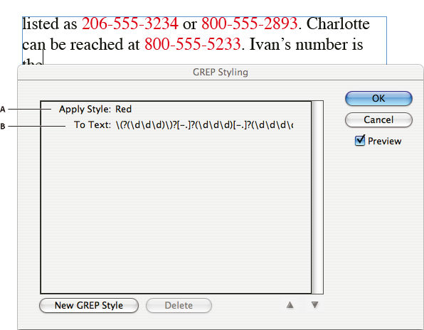 GREP is an advanced, pattern-based search technique. You can use GREP styles to apply a character style to text that conforms to the GREP expression you specify. For example, suppose you want to apply a character style to all the phone numbers in text. When you create a GREP style, you select the character style and specify the GREP expression. All paragraph text that matches the GREP expression is formatted with the character style.