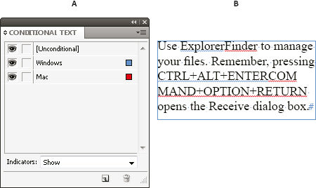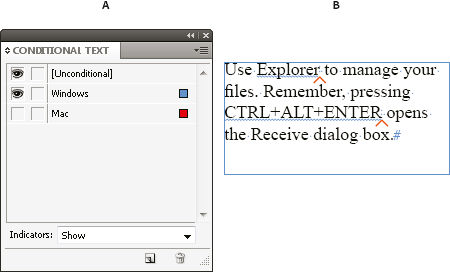 Conditional text is a way to create different versions of the same document. After you create conditions, you apply them to ranges of text. You can then create different versions of documents by showing and hiding conditions. For example, if you’re creating a computer manual, you can create separate conditions for Mac OS and Windows. Before you print the Mac OS version of the user guide, you can show all text to which the “Mac” condition is applied and hide all text to which the “Windows” condition is applied. You can then reverse the condition states for printing the user guide for Windows.