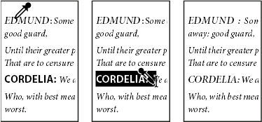 1. With the Eyedropper tool  , click the text that is formatted with the attributes you want to copy. (The text can be in another open document.) The eyedropper pointer reverses direction, and appears full  , to indicate that it’s loaded with the attributes you copied. When you position the eyedropper pointer over text, an I-beam appears next to the loaded eyedropper  .