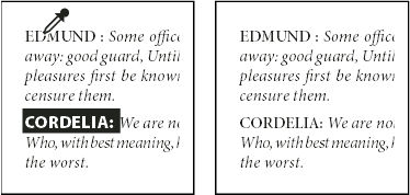2. Using the Eyedropper tool  , click the text from which you want to copy attributes. (The text from which you want to copy attributes must be in the same InDesign document as the text you want to change.) The Eyedropper tool reverses direction and appears full  , to indicate that it’s loaded with the attributes you copied. The attributes are applied to the text you selected in step 1.