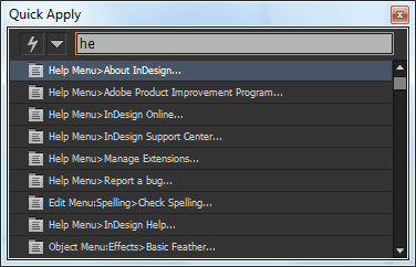 The name you type doesn’t need to be an exact match. For example, typing he will locate styles such as Head 1, Head 2, and Subhead, as well as Help menu commands such as Help Menu > InDesign Help.