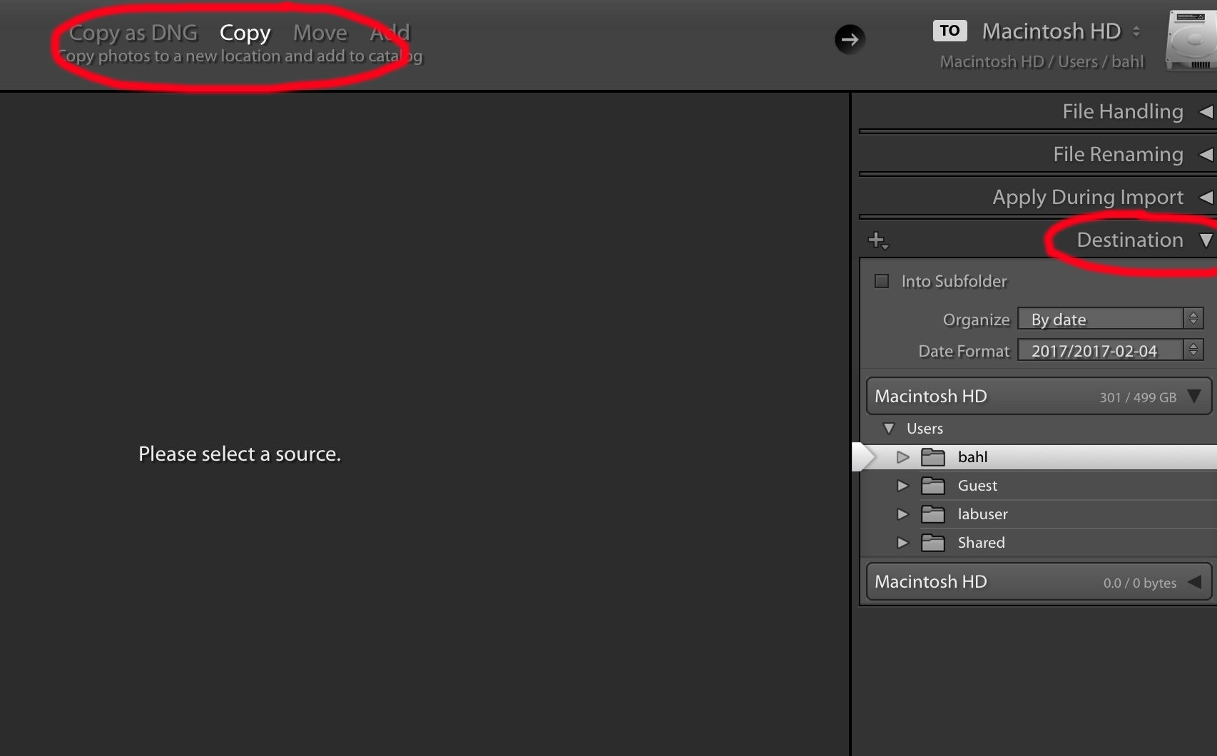In the Import window of Lightroom, change the mode from Add to Copy in the upper left corner of the window.