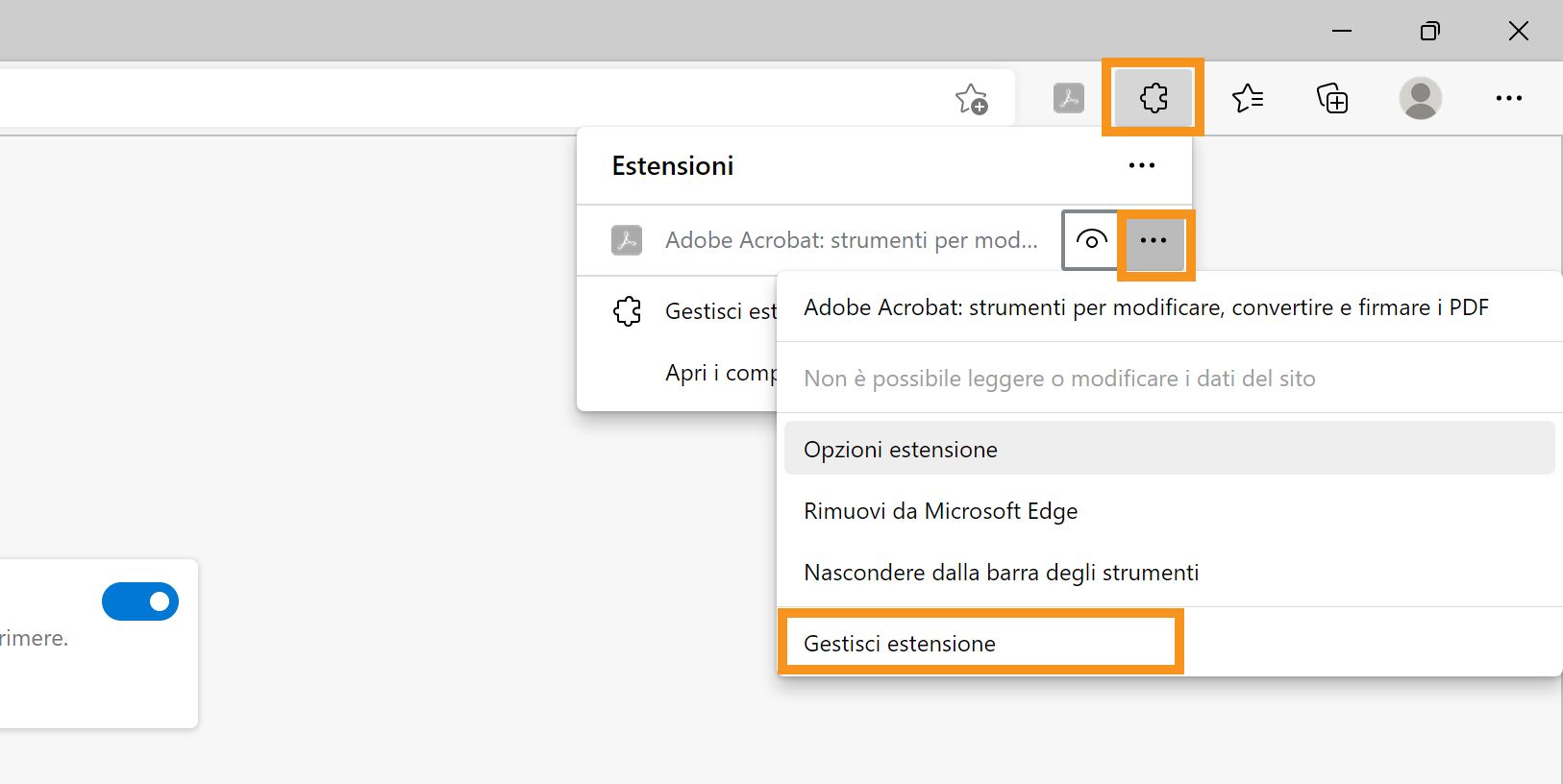 Avvia il browser Microsoft® Edge. Dal menu Estensioni (icona a forma di puzzle), seleziona il menu delle opzioni ( . . . ) per Adobe Acrobat, quindi seleziona Gestisci estensione.